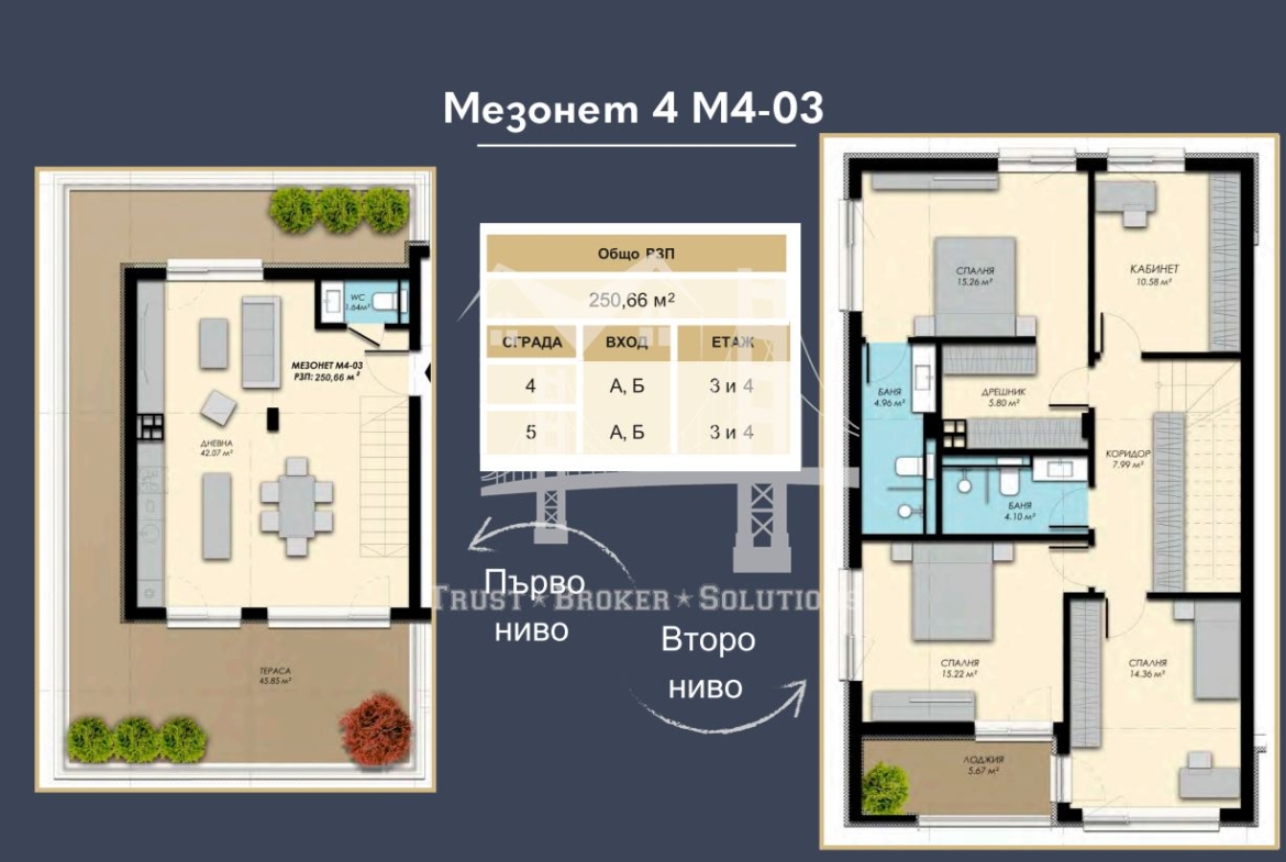 Агенция „Trust Broker Solutions” предлага на Вашето внимание изключително просторен и функционален мезонет, разположен в с. Бистрица, София – перфектен избор за семейства, които търсят комфорт на две нива, качество на ново строителство и спокойствие близо до природата. Жилището впечатлява с балансирано разпределение и модерна сграда с асансьор, осигуряваща удобен достъп. Идеологията на комплекса, разположен в живописния район на Бистрица в близост до Витоша планина, е да осигури паркова среда с фонтани, зона за релакс, спортна площадка и изцяло подземно паркиране. Мезонетите създават усещане за къща.